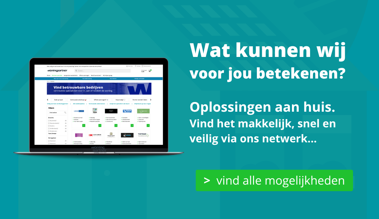 Woningpartner is het zoekplatform waar je eenvoudig en vertrouwd de oplossing kunt vinden om in contact te komen met erkende en vertrouwde bedrijven in je eigen omgeving die zich hebben aangesloten bij ons netwerk. Wij zijn de spil voor jouw zoekopdracht naar de oplossing om met betrouwbare bedrijven die de oplossing bieden op je vraag aan huis.