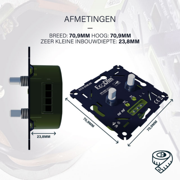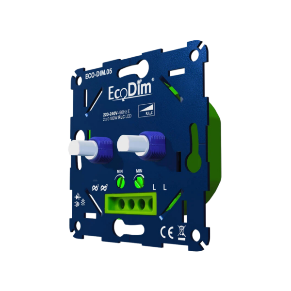 De EcoDim.05 is een universele led duo dimmer die geschikt is voor 2x 0-100W LED vermogen per kanaal. Deze .05 dimmer van EcoDim biedt geruisloze dimbaarheid van vol aan naar volledig uit, wat zorgt voor een comfortabele herldere en sfeervolle zachte verlichting. uiteraard is dit afhankelijk van de sterkte van welk type ledlampen er aangesloten zijn.