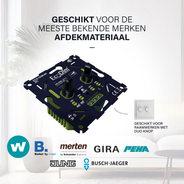 Geschikt voor circa 90% van alle dimbare ledlampen en past in afdekmateriaal van A-merken zoals Busch-Jaeger, Gira, JUNG & Berker.