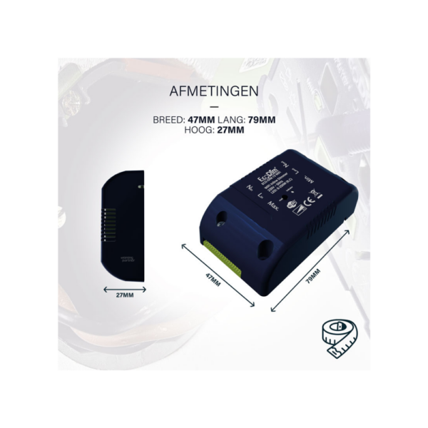 Wil je jouw verlichting draadloos, comfortabel en slim aansturen via een App en verlichting kunnen dimmen zonder extra hubs? Deze EcoDim.13 WiFi inline dimmer maakt elke dimbare LED-lamp slim en eenvoudig te bedienen via je smartphone, spraakbesturing (Google Assistant & Alexa) of via een draadloze wandschakelaar. Deze 250 watt LED-dimmer biedt geruisloos dimmen, optimale lichtstabiliteit en een makkelijke installatie op of in het plafond voor een dimbare voeding van je lichtbron.