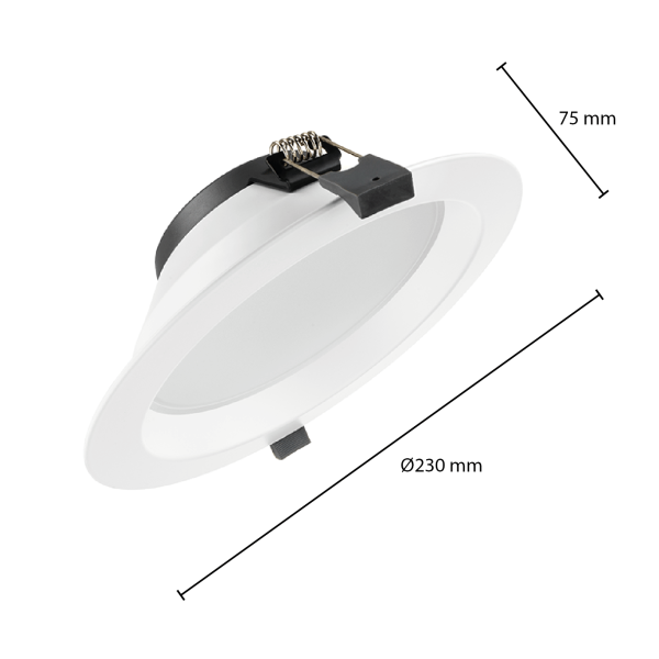 Dankzij de zaagmaat van ø195 millimeter en een inbouwdiepte van 28 millimeter is deze lamp in te bouwen in de meeste plafonds. De IP44-bescherming maakt de lamp ook geschikt voor vochtige ruimtes zoals de badkamer.