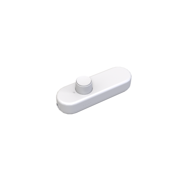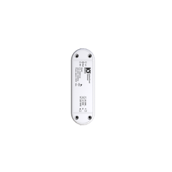 De dimmer heeft een draaiknop waarmee je het licht traploos instelt. De witte behuizing sluit goed aan bij lichtgekleurde snoeren en interieurs, zonder op te vallen. Door het compacte ontwerp past hij netjes tussen standaard netsnoeren.
